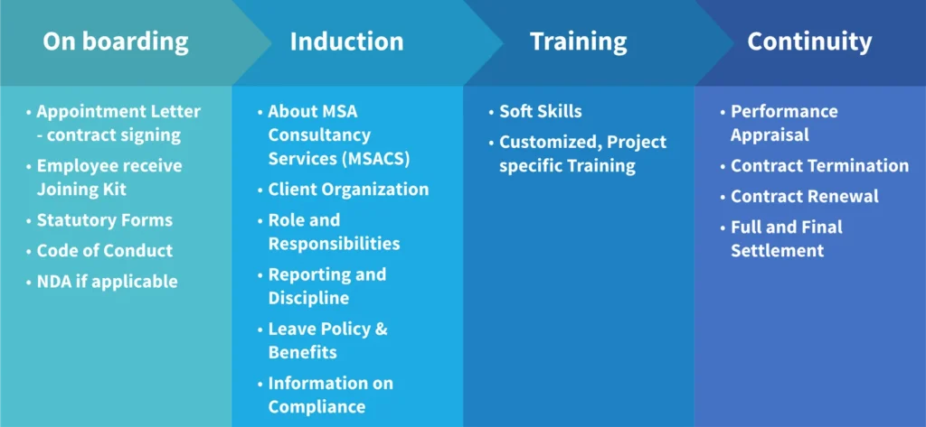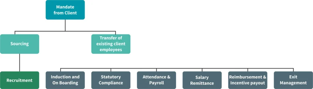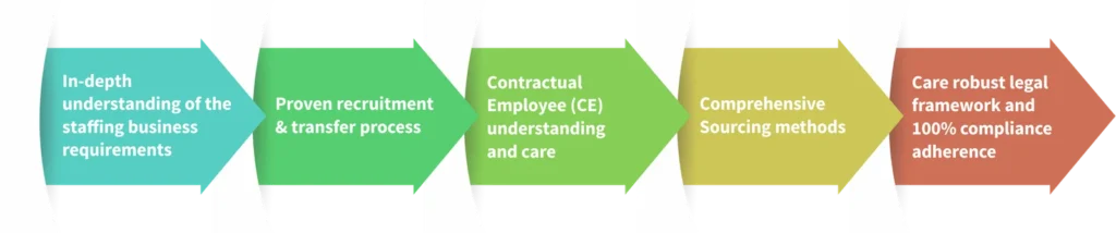 Our professional staffing service model handles the HR processes on an end-to-end basis covering recruitment, salary fitment, on boarding, pay rolling, compliance and off-boarding.